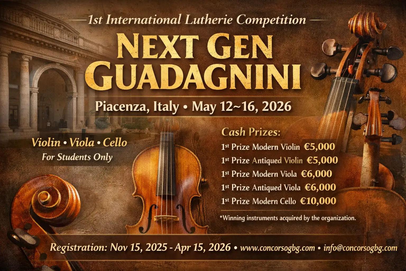 The competition is organized by Concorso Guadagnini, an established reference point in the international lutherie scene.